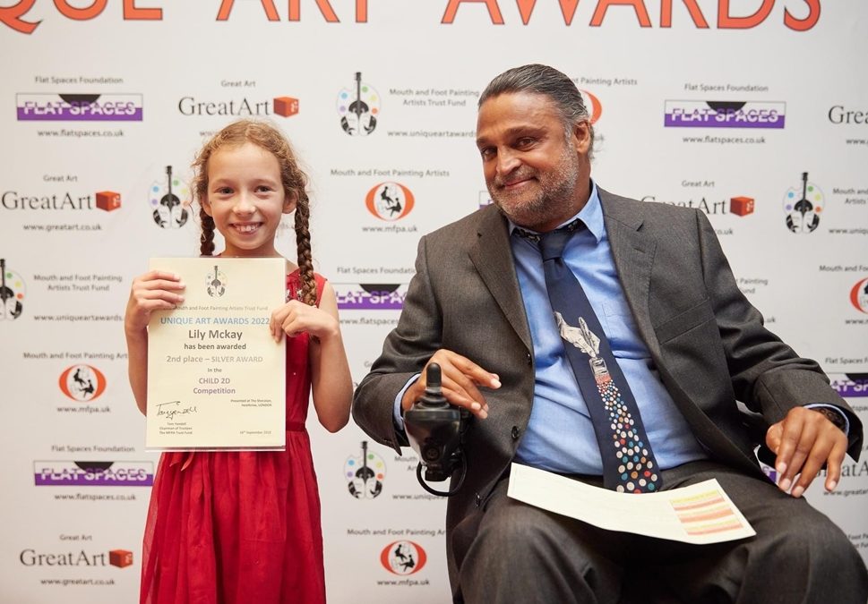 This picture is called Blue Mountain which Lily painted with acrylics using sponges and a palette knife. She entered the painting into the unique art awards for children with disabilities. It is sponsored by the foot and mouth painters association.